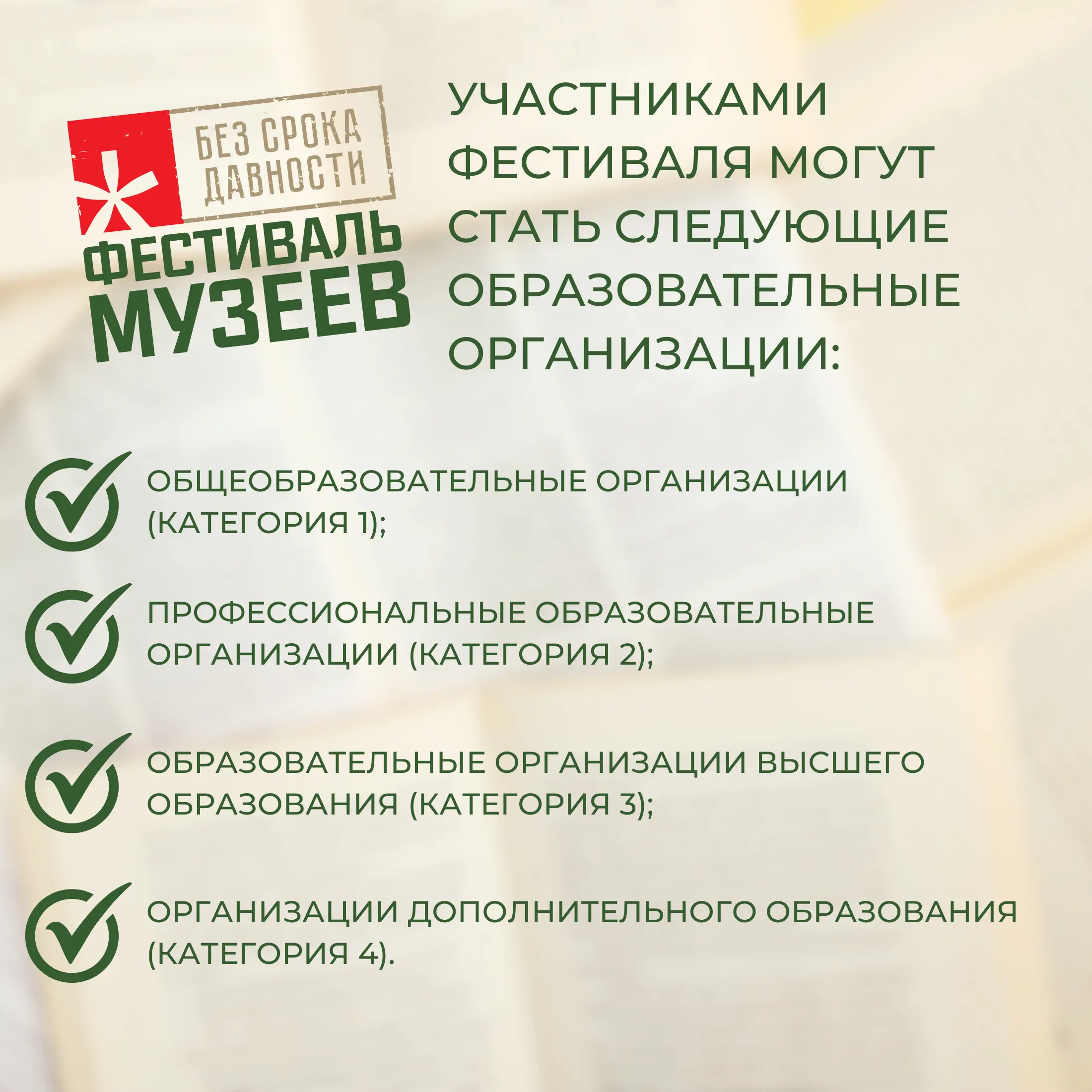 К участию в Фестивале приглашаются сотрудники и обучающиеся образовательных организаций следующих категорий: общеобразовательные организации, профессиональные образовательные организации, образовательные организации высшего образования, организации дополнительного образования.