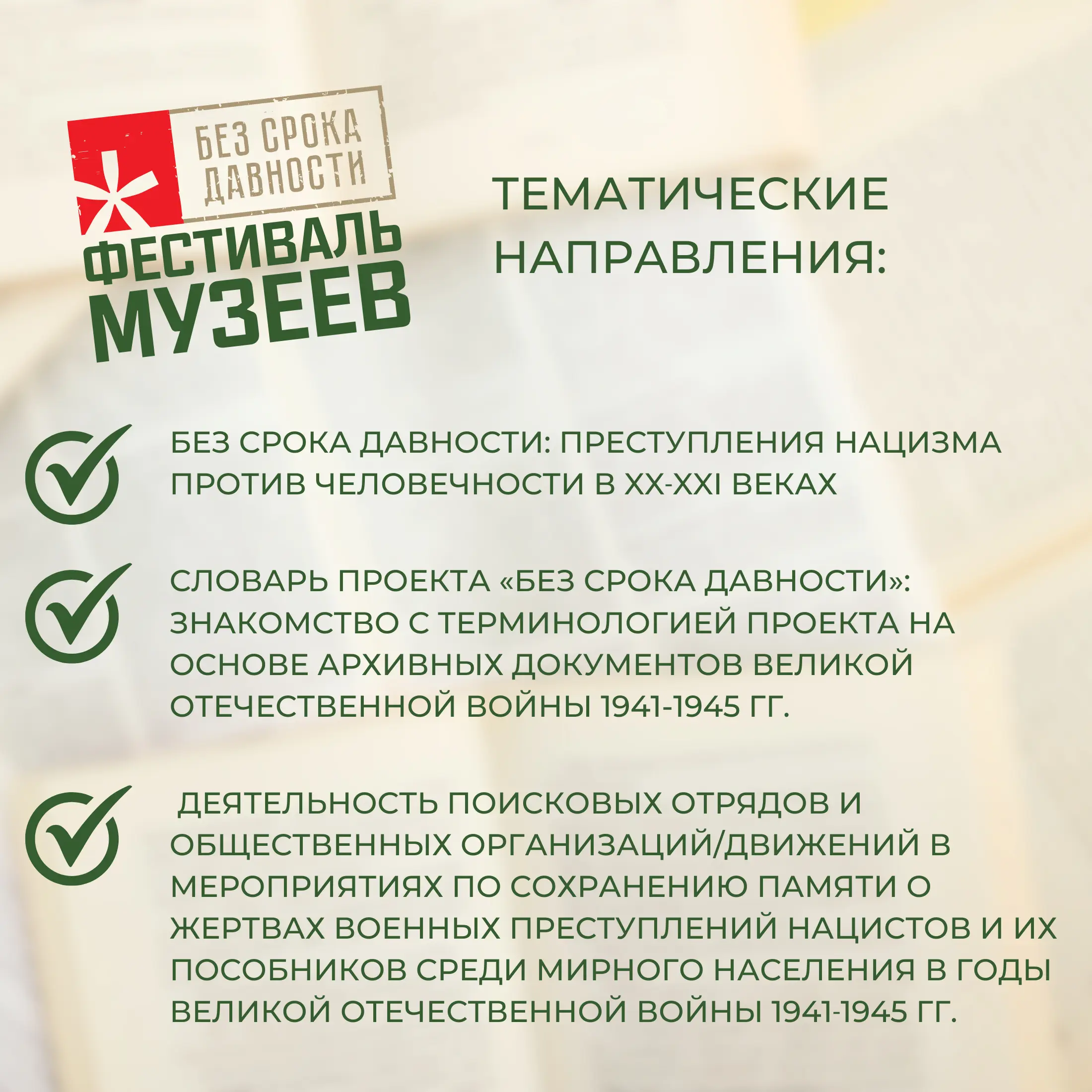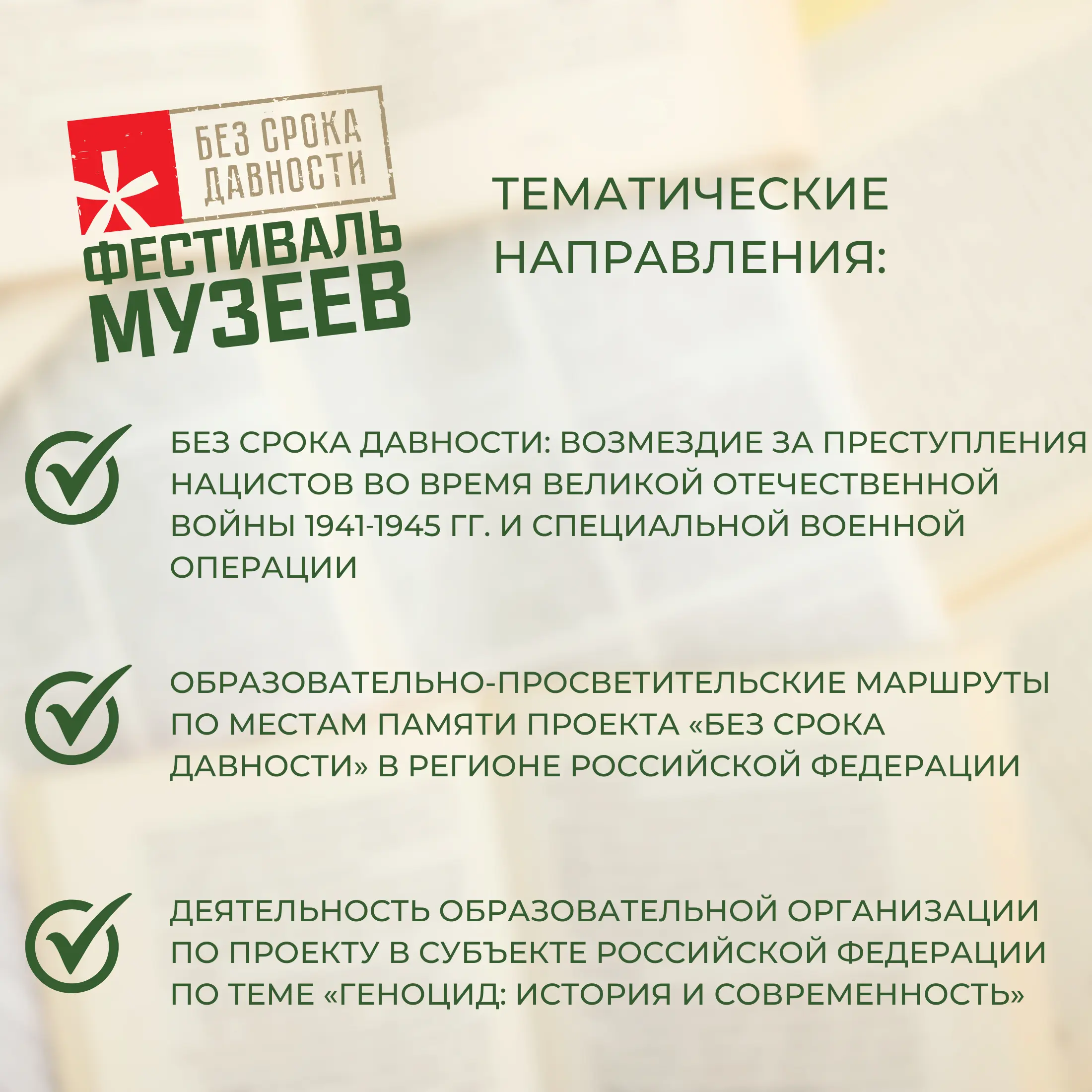 - образовательно-просветительские маршруты по местам памяти проекта «Без срока давности» в регионе Российской Федерации;