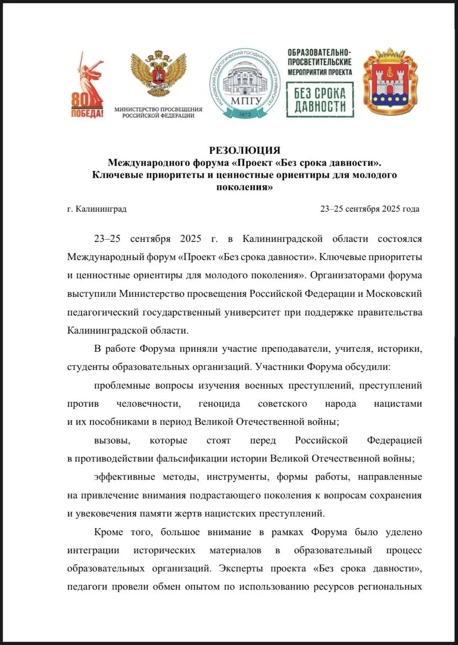 На итоговой конференции 25 сентября 2025 года принята РЕЗОЛЮЦИЯ Международного форума «Проект «Без срока давности». Ключевые приоритеты и ценностные ориентиры для молодого поколения».
