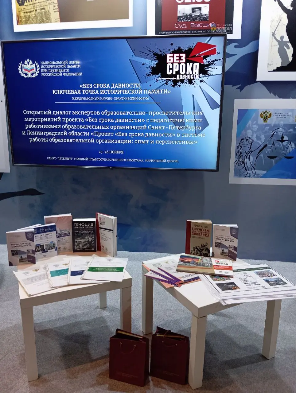 Участникам Форума во время презентационной сессии «Материалы проекта «Без срока давности» на службе историческому просвещению детей и молодежи» представители Минпросвещения России и МПГУ презентовали «экосистему» образовательных организаций, реализующих мероприятия проекта «Без срока давности». В «экосистему» входят семь международных и всероссийских конкурсов Проекта, полноценный пакет методических материалов, включающих в себя методический конструктор для педагогов, модули «Без срока давности» для обучающихся 9-10 классов, студентов СПО и тех, кто получает высшее педагогическое образование, методическое пособие «Проведение памятного дня «Без срока давности». Среди представленных материалов сотрудники Минпросвещения России и МПГУ презентовали выставку «Судебные дела по процессам о геноциде мирного населения СССР в годы Великой Отечественной войны 1941–1945 гг.» и серию антинацистских плакатов, которые активно используются педагогами образовательных организаций.