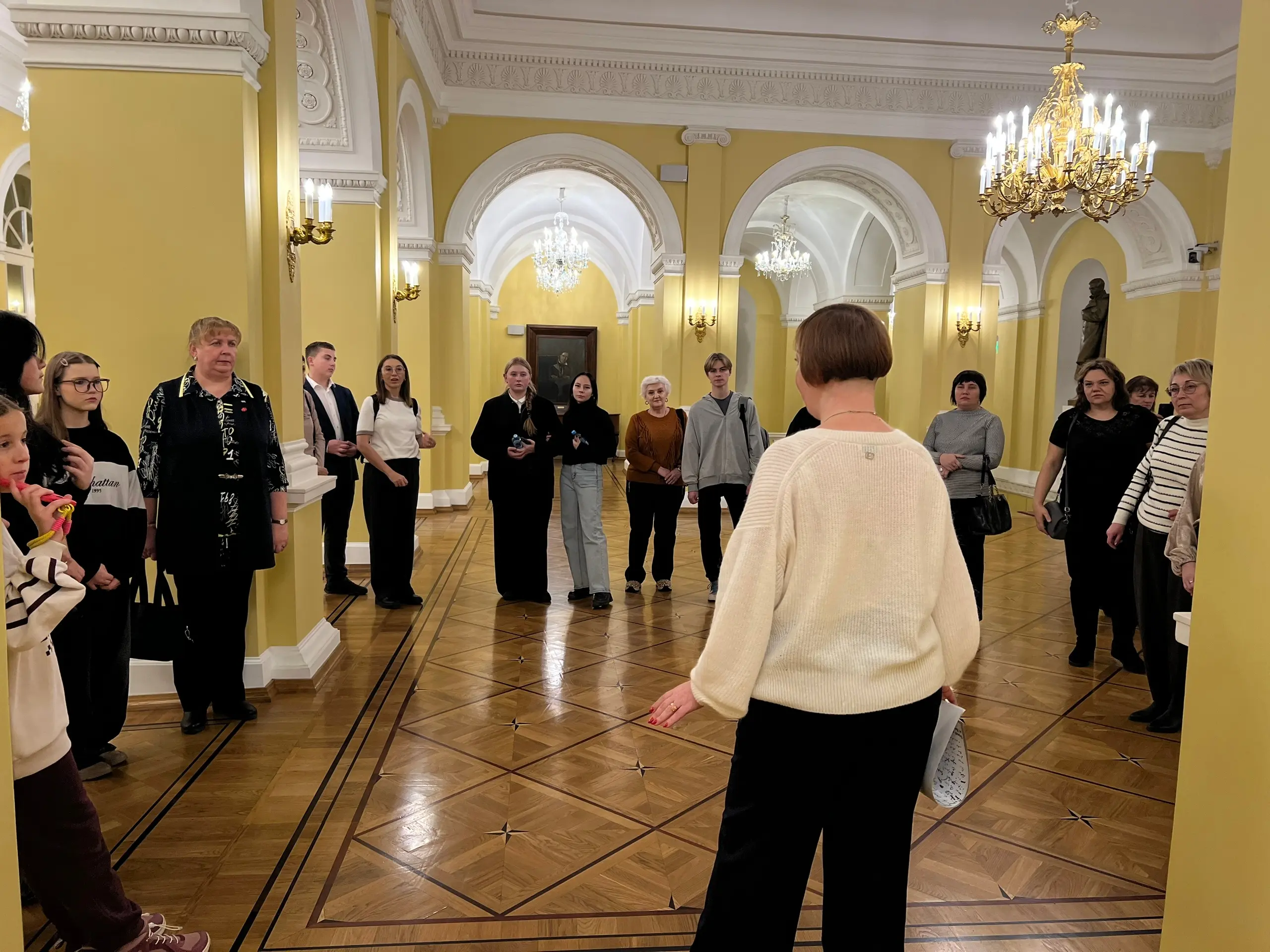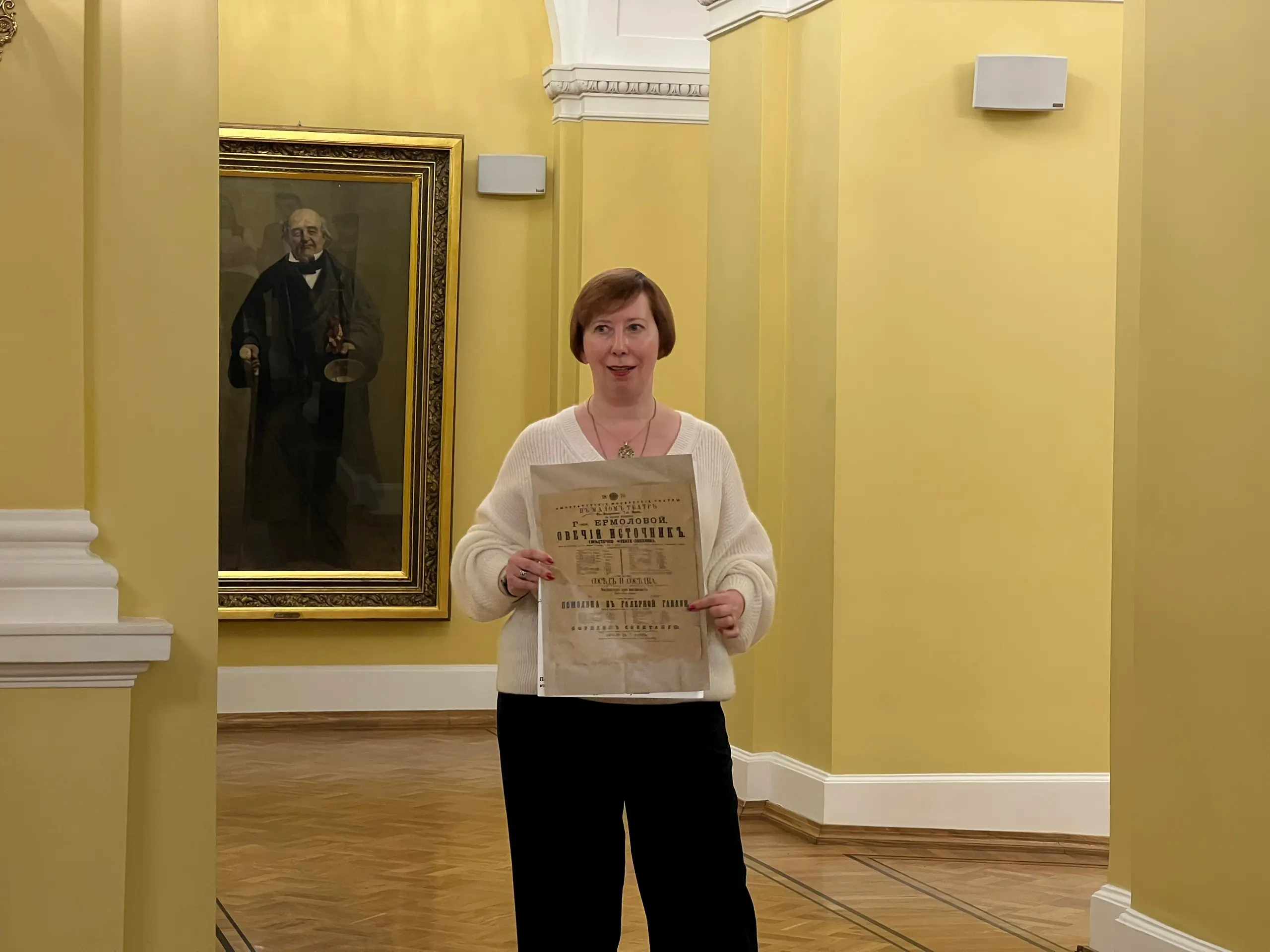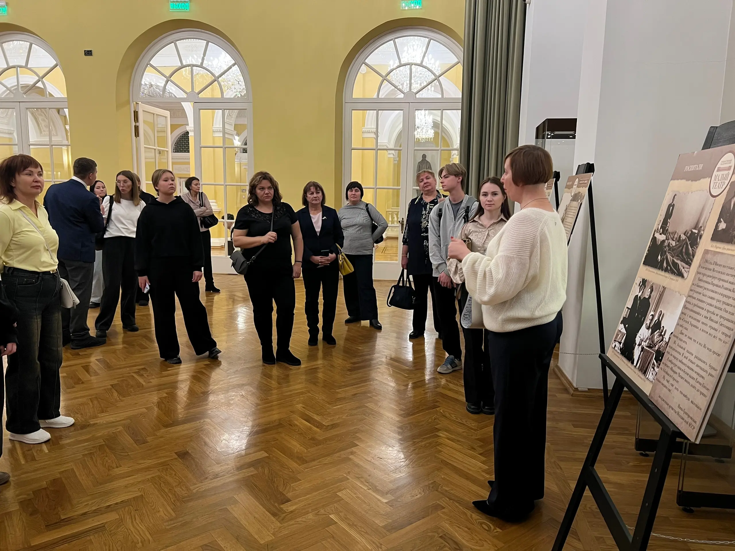 В рамках экскурсии по зданию в Театральном проезде конкурсанты познакомилась с историей театра, посетили закулисье, включая суфлерскую будку, и даже немного понаблюдали за репетиций спектакля. Особое место в театре - Щепкинское фойе. Именно там участникам экскурсии рассказали о жизни театра в период Великой Отечественной войны.