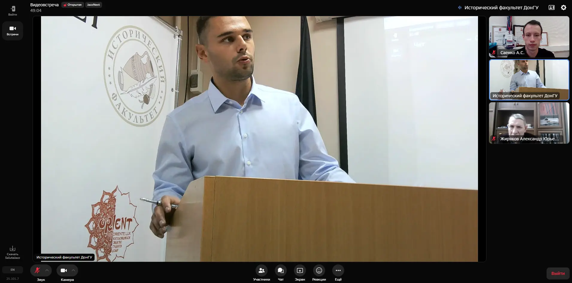 В дистанционном формате в работе круглого стола принял участие ведущий специалист Управления общественных проектов Московского педагогического государственного университета Антон Саенко. Его выступление было посвящено вопросу изучения условий эффективного функционирования и развития Опорных площадок проекта «Без срока давности» в субъектах Российской Федерации. Антон Сергеевич рассказал о работе, которую проводит МПГУ в рамках выполнения научно-исследовательской работы по изучению системы организационно-методической поддержки реализации образовательно-просветительских мероприятий проекта «Без срока давности» в субъектах Российской Федерации. Участники круглого стола познакомились с образовательной средой проекта «Без срока давности», включая учебную и внеучебную деятельность образовательной организации в рамках проекта. На примере Опорной площадки проекта в Донецкой Народной Республике – ГБОУ «Школа № 6 Амвросиевского м.о.» (руководитель Опорной площадки – учитель истории Лариса Тур) рассмотрены условия эффективной работы образовательной организации по сохранению памяти о геноциде советского народа нацистами и их пособниками в годы Великой Отечественной войны.