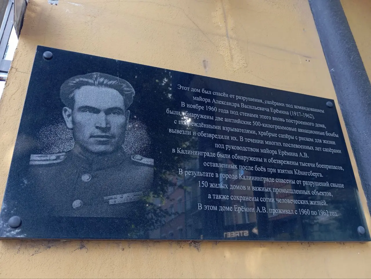 Ещё одним местом памяти в Калининграде является дом № 35–37 на Ленинском проспекте, который был спасён от разрушения сапёрами под командованием майора Александра Васильевича Ерёмина. В ноябре 1960 года под стенами дома были обнаружены две английские 500-килограммовые авиационные бомбы с повреждёнными взрывателями, сапёры с риском для жизни вывезли и обезвредили их. Сегодня на этом доме установлена мемориальная доска, напоминающая о храбрости советских сапёров. Всего саперами было спасено более 150 домов и сотни жизней.