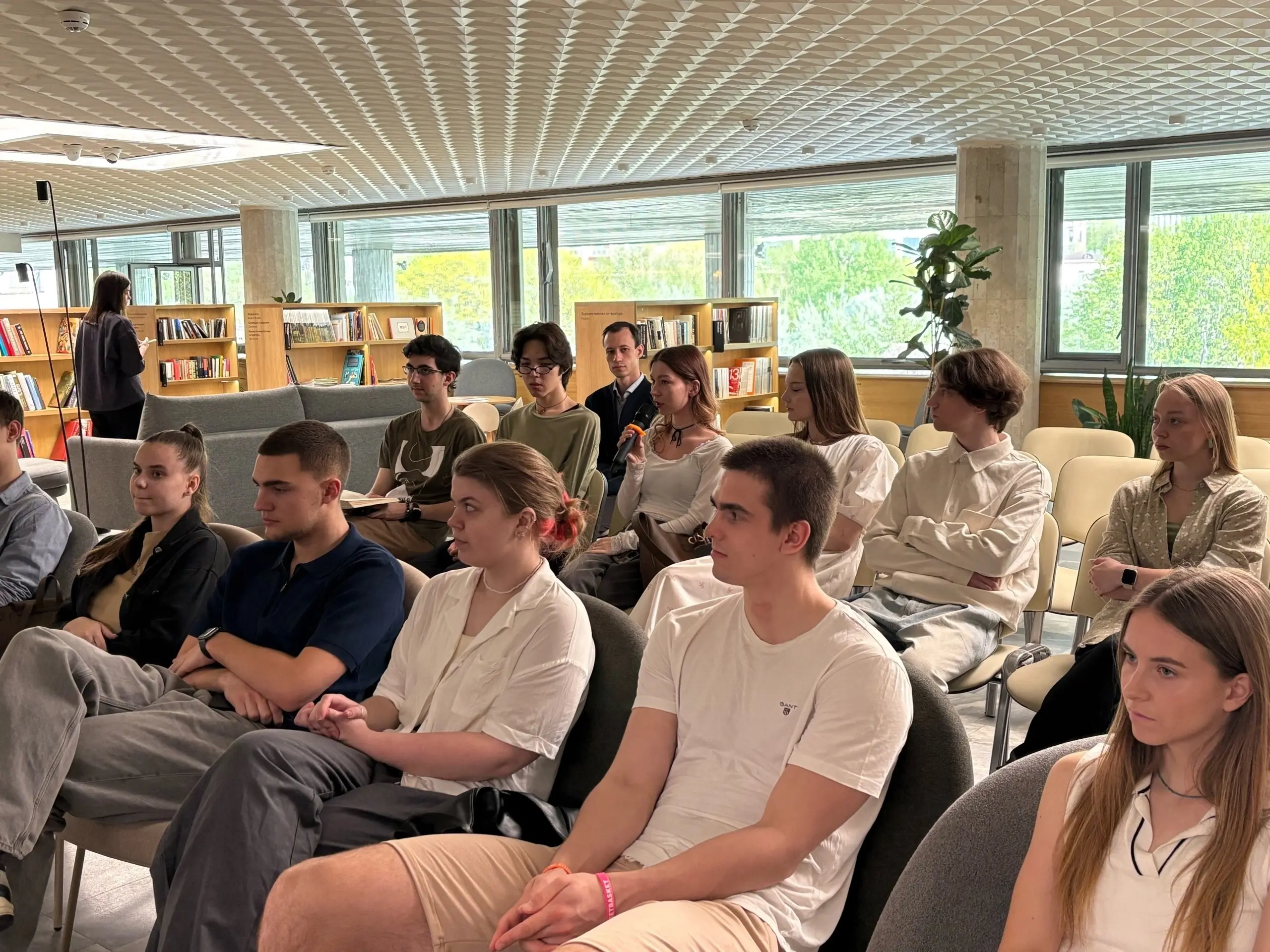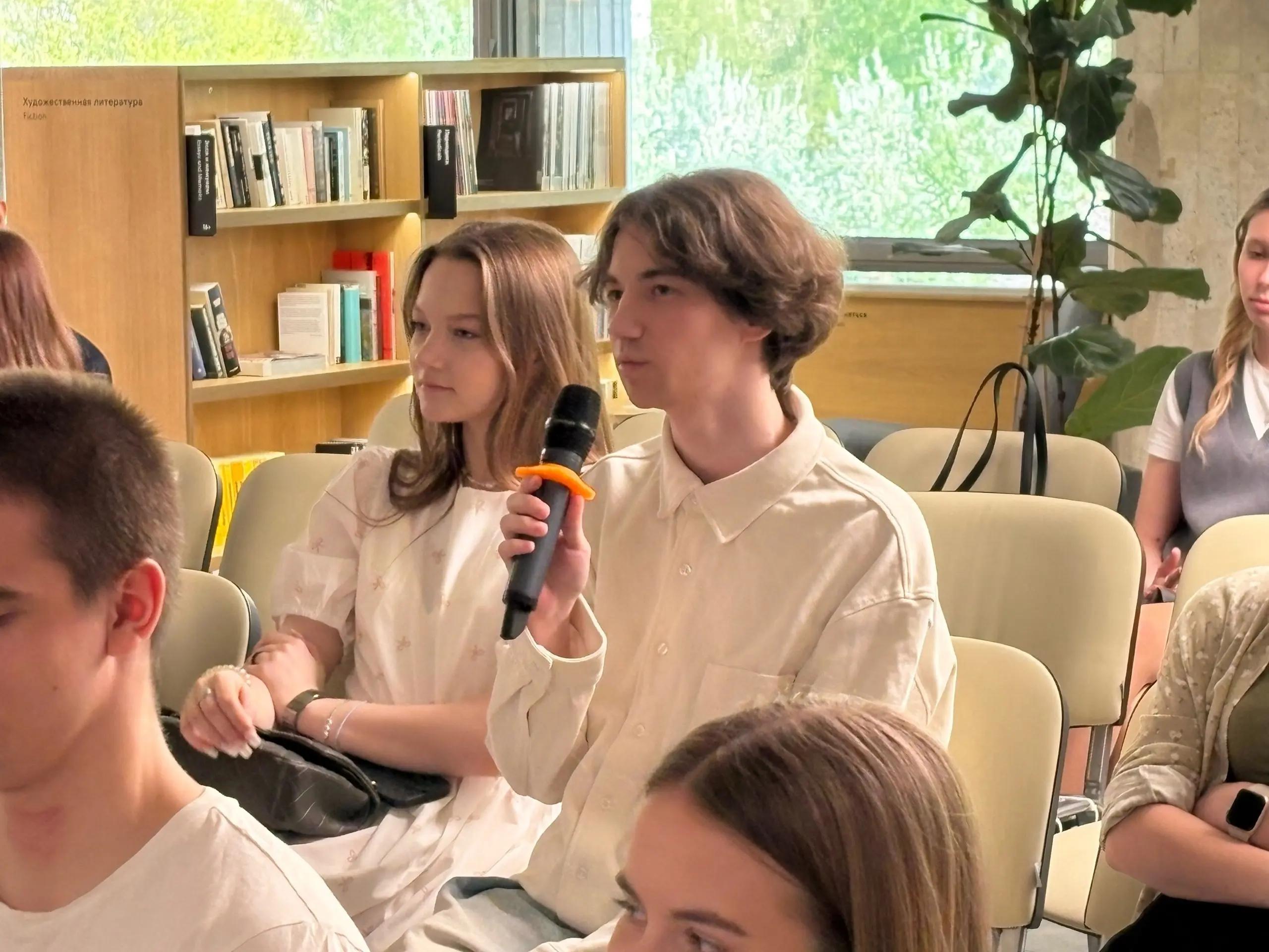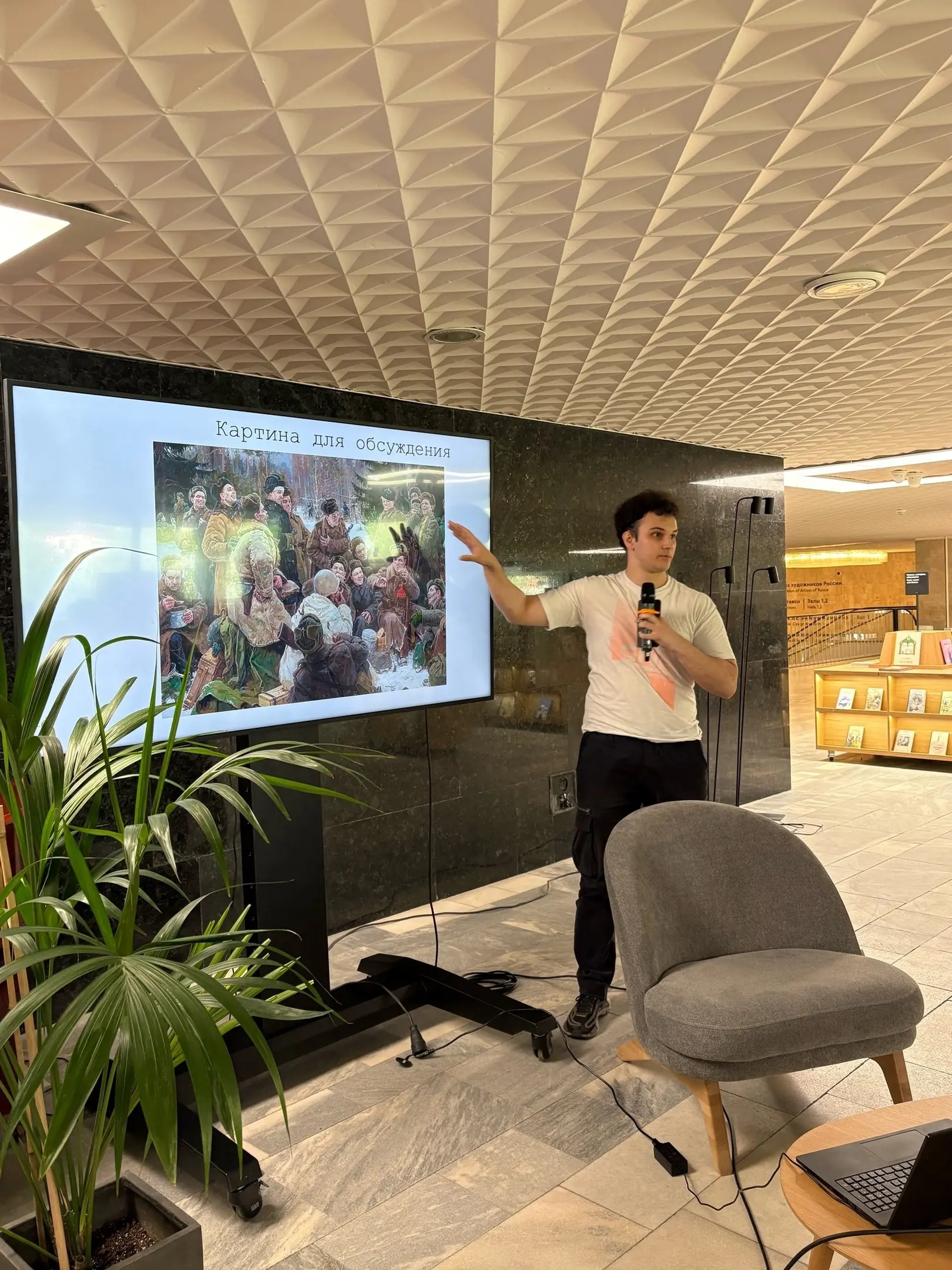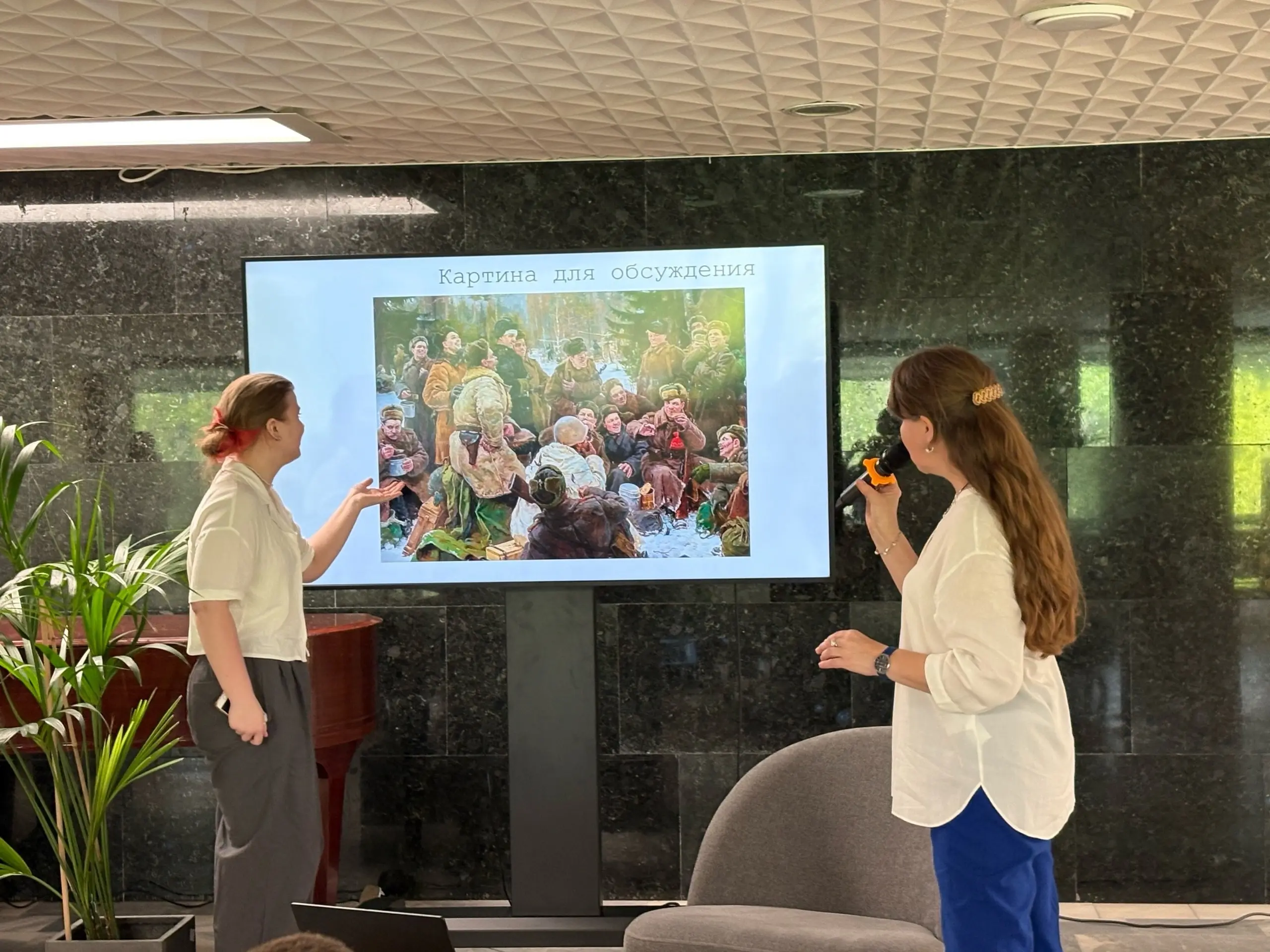 Мастер-класс и обсуждение продолжились во время посещения выставки «1418 дней. К 80-летию Победы». На выставке представлены более 200 произведений искусства из коллекции Третьяковской галереи.
