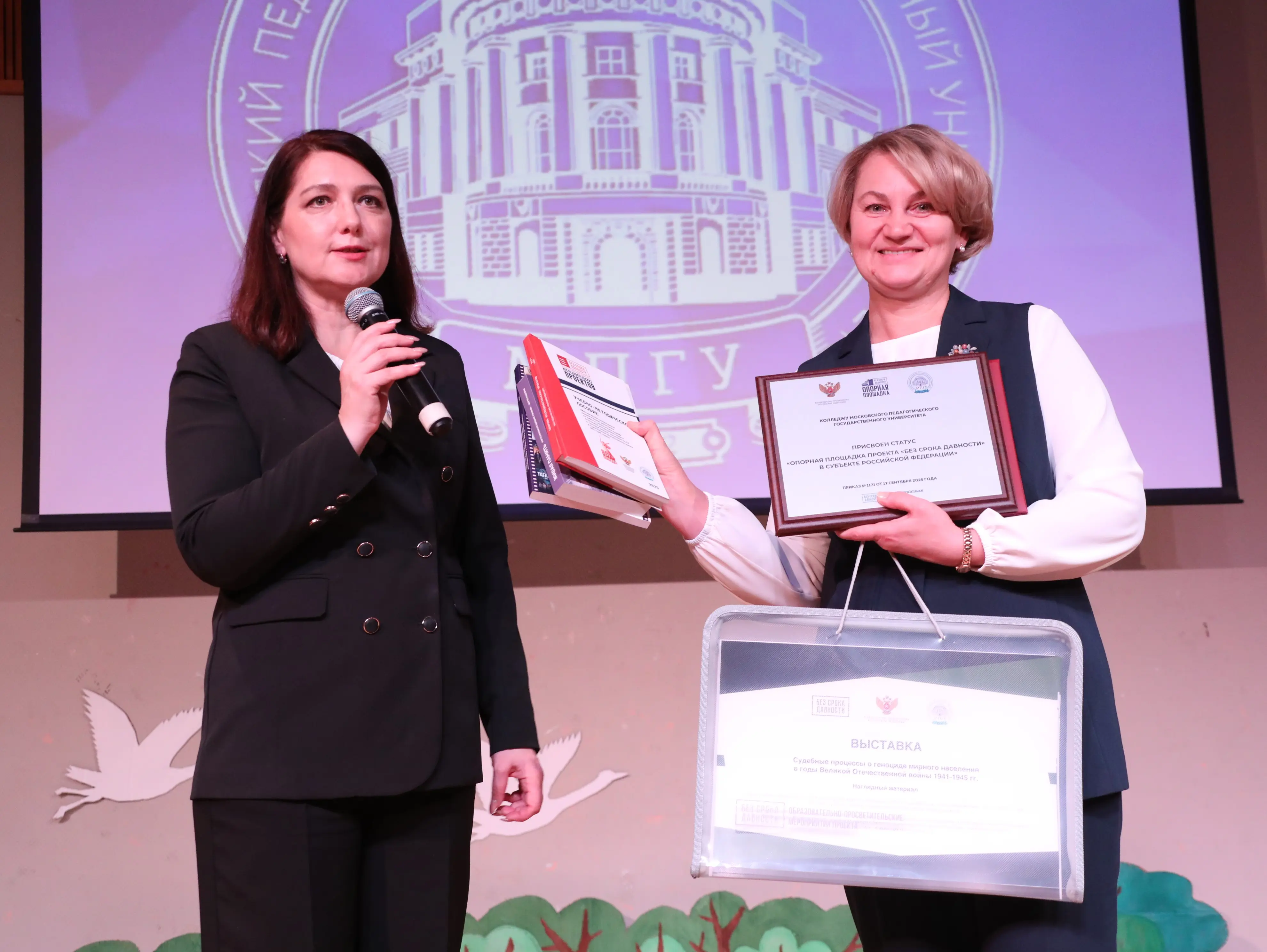 В 2025 году Приказом Минпросвещения России колледжу МПГУ был присвоен статус «Опорная площадка проекта «Без срока давности» в субъекте Российской Федерации». И сегодня, в этот знаменательный день в жизни колледжа, координатор направления «Опорные площадки» федерального проекта «Без срока давности» Наталья Юрьевна Забродская поблагодарила директора колледжа МПГУ Елену Владимировну Куренкову за значимый вклад в дело сохранения исторической памяти, поздравила с присвоением этого почетного статуса, торжественно вручила документы и памятную табличку.