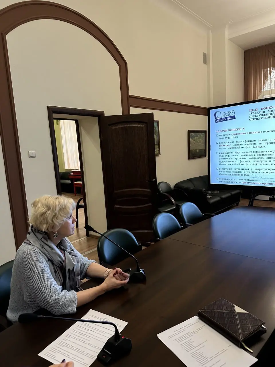 Лариса Витальевна ознакомила присутствующих с перспективами развития проекта «Без срока давности» на 2025 год. «В рамках Проекта Министерством проводятся 7 конкурсов для обучающихся и педагогов по самым разным направлениям деятельности, созданы 4 электронных образовательных ресурса для методической поддержки педагогов и самостоятельного освоения обучающимися такой сложной темы, как «Геноцид», – отметила Лариса Витальевна.
